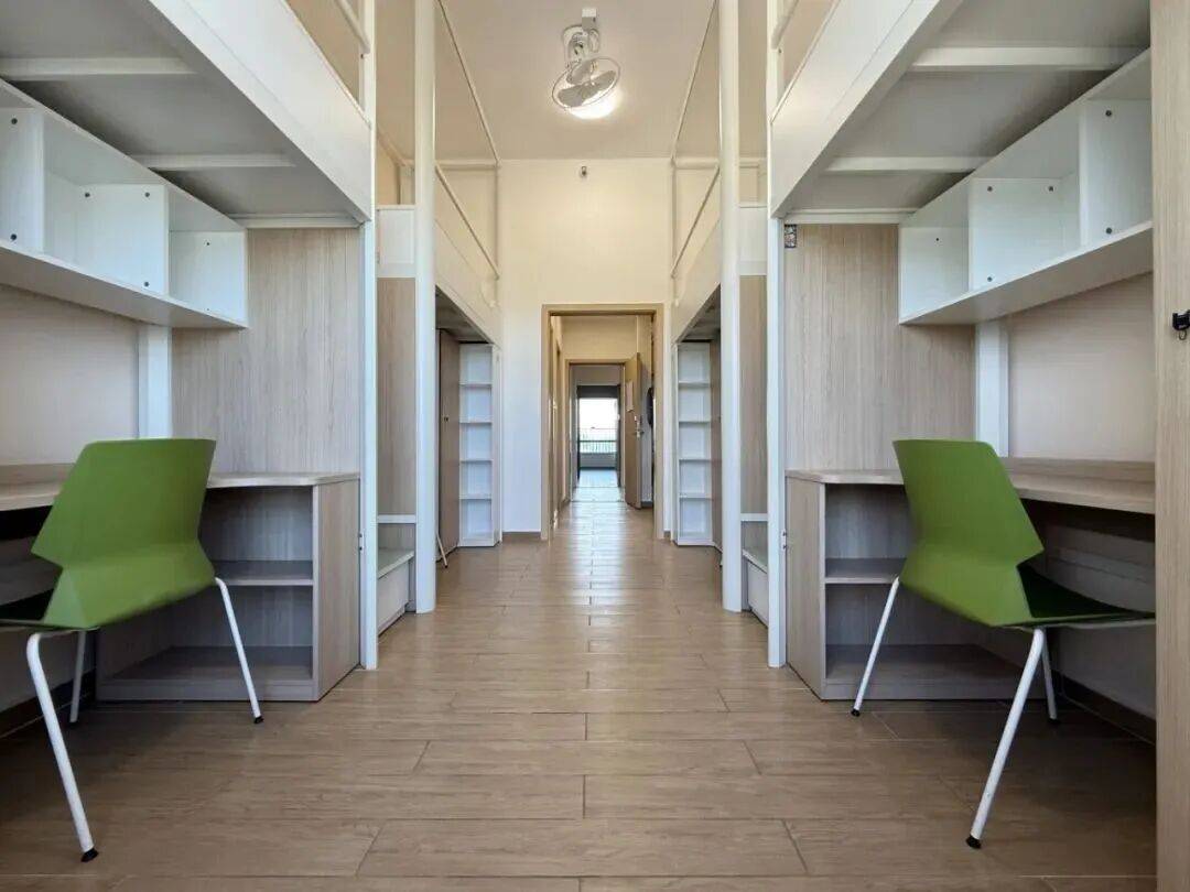 宽敞舒适的四人间为学生提供了充裕的生活空间,配备冬暖夏凉的智能空调与风扇、干湿分离的独立卫浴,每间宿舍还配置两套书桌与座椅,方便学生在课余时间自主学习与阅读。