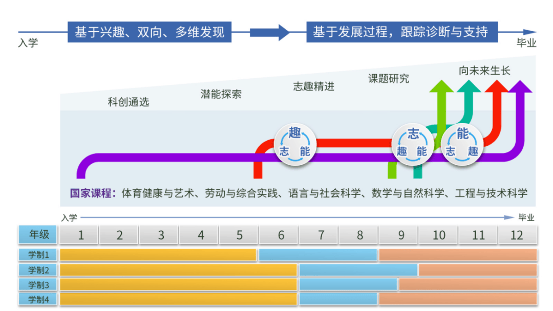 学校依托集团内多校区协同发展的体制优势,在十二年贯通培养体系中构建了“未来公民素养课程—志趣涵养课程—优能发展课程”课程群,推动全学科育人,打造适应未来的新型人才培养体系。课程体系聚焦三大关键能力,着力支持学生在全面发展基础上的个性化成长,助力每一位学生成为适应未来挑战的优秀公民。