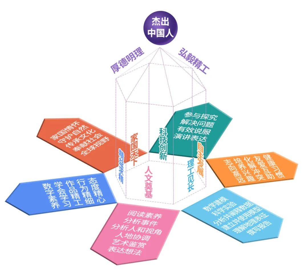 首先是6大核心素养维度,这是学生全面成长的大方向,分别是:人文奠基、理工见长、自主发展、精益求精、家国天下、引领创变。